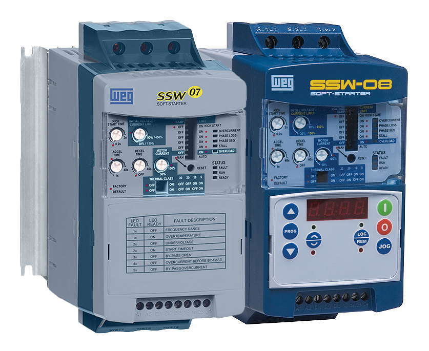 Пристрої плавного пуску SSW-07/08 WEG за рахунок компактного виконання легко інтегруються в шафи керування. Моделі цієї серії мають вбудований захист електродвигунів. Вони адаптуються до потреб споживача за допомогою опціональних аксесуарів, таких як вбудована або дистанційна панель керування, комунікаційний інтерфейс, вхід термодатчиків мотора (РТС).