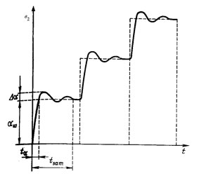 При этом возможны колебания углового вала двигателя относительно установившегося значения. Эти колебания обусловлены запасом кинетической энергии, которая была накоплена валом двигателя при отработке угла. Кинетическая энергия преобразуется в потери: механические, магнитные и электрические. Чем больше величина перечисленных потерь, тем быстрее заканчивается переходный процесс отработки единичного шага двигателем.