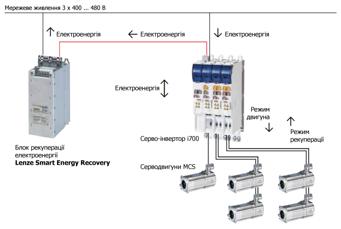 Ми можемо запропонувати використання рекуператора Lenze для перетворення кінетичної енергії гальмування в електрична енергію. Цю енергія може віддаватись в мережу або використовуватись іншими споживачами електричної енергії обладнання повторно.