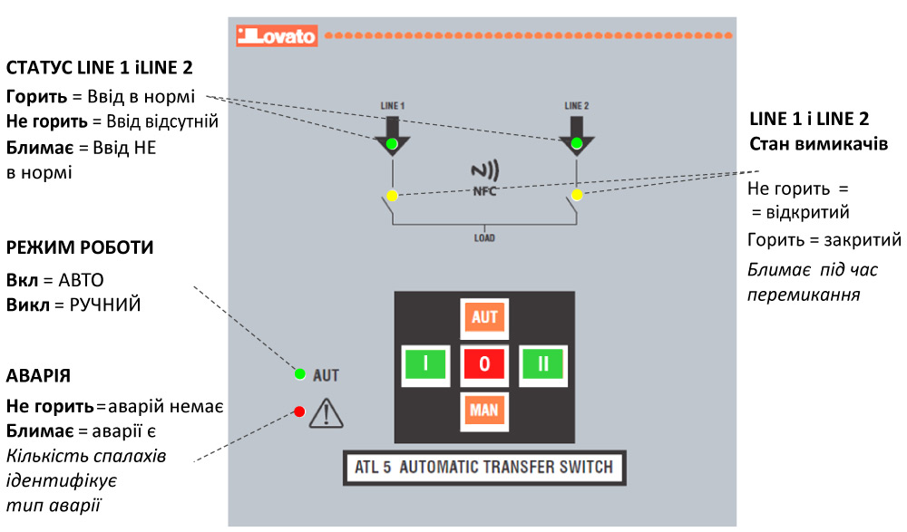 Передня панель і світлодіодні індикатори на передній панелі забезпечують просту і чітку візуалізацію стану системи ATS. Вбудований зв'язок NFC дозволяє встановлювати номінальні параметри, пороги захисту, налаштування перемикання, функції вводу/ виводу тощо за допомогою пристроїв Android і додатку LOVATO NFC, що робить програмування простим, інтуїтивно зрозумілим і не вимагає використання сполучних кабелів.