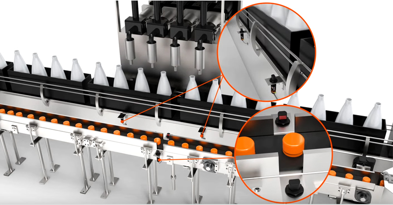 Датчики RRQPS з боковою чутливою поверхнею використовуються для виявлення положення лотків і наявності кришок на пляшках.