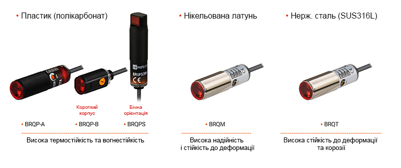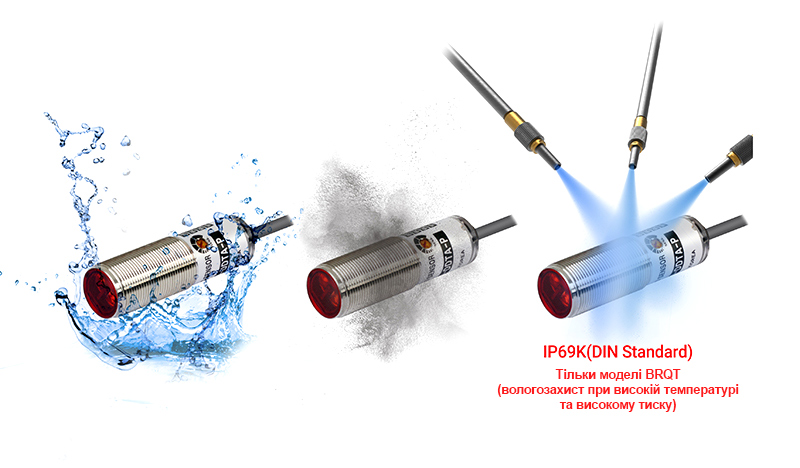 Структура захисту IP67 забезпечує стабільну та безпомилкову роботу навіть у вологому чи запиленому середовищі, а моделі з захистом IP67K також витримують високий тиск і високу температуру. Моделі BRQT відповідають ступеням захисту IP67 та IP69K.