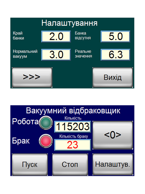 Фахівці СВ АЛЬТЕРА Черкаси розробила та впровадила систему керування детектором вакууму. Детектор призначений для вибраковування банок, неякісно закупорених кришками типу twist off. Вибраковування відбувається за величиною прогину кришки вакуумом, що утворився. Пристрій змонтований на базі пластинчастого конвеєра, по якому переміщуються банки, що потрапляють в зону сканування. Результат сканування аналізується та звіряється з еталоном. При невідповідності до еталону банка виводиться із потоку пневматичним пристроєм.