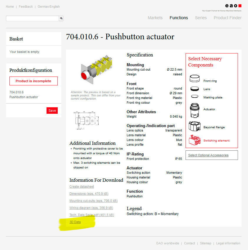Швейцарська компанія ЕАО, виробник найякісніших комутаційних виробів в світі, зробила на своєму сайті додаток для зручного та швидкого вибору своїх продуктів. За допомогою цього додатку Ви можете легко підібрати як спеціальні, так і стандартні кнопки, перемикачі та тумблери різного призначення. Крім детальних технічних характеристик та габаритних розмірів для деяких серій існує можливість друку зображення в 3D (потрібно пройти нескладну процедуру реєстрації), що є дуже корисним бонусом для розробників та проектантів. Технічні матеріали для скачування пропонуються в різних форматах для зручності користувача.