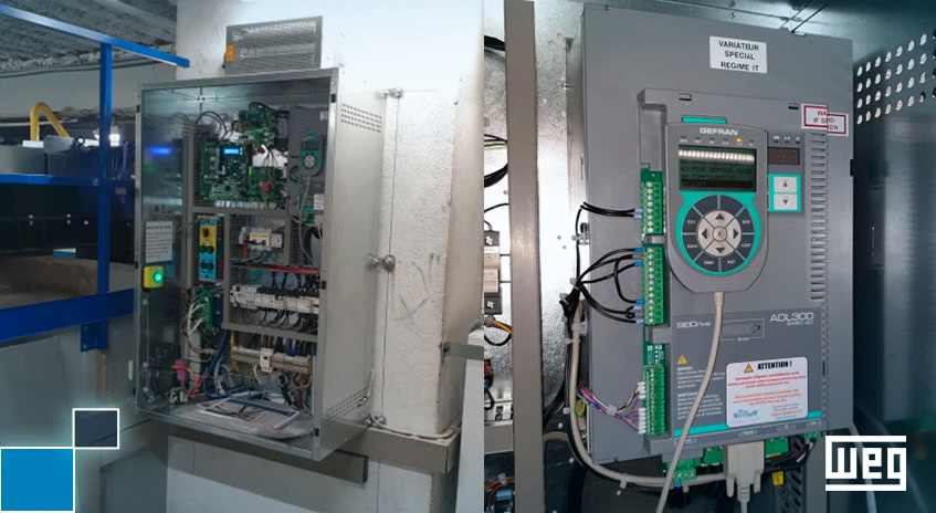 Для цього застосування було використано два перетворювачі частоти WEG ADL300 потужністю 22 кВт, які працюють у режимі керування електродвигунами зі зворотним зв’язком за швидкістю. Ці приводи розроблені спеціально для ліфтових систем, що потребують високої продуктивності, плавного керування рухом і точного позиціонування.