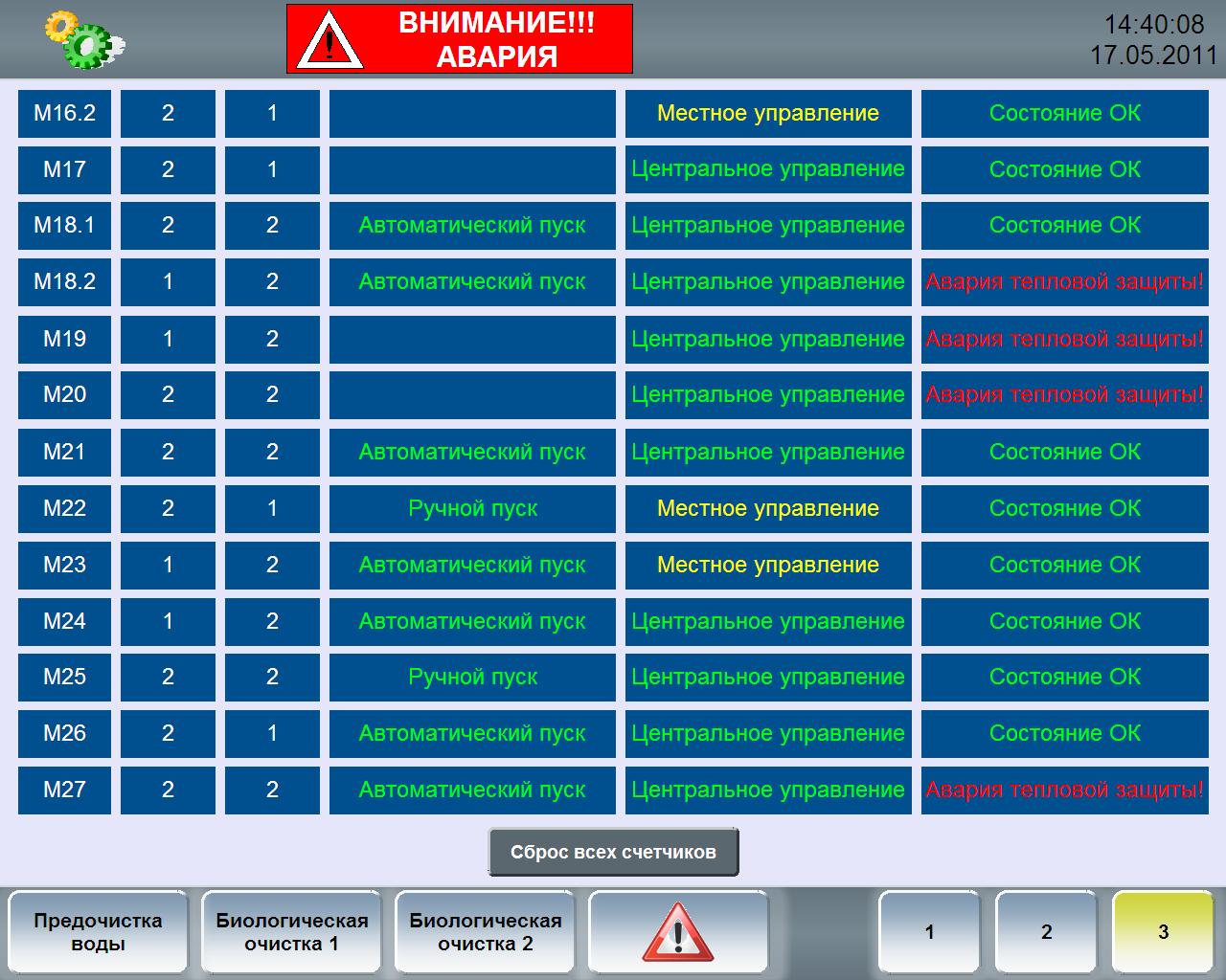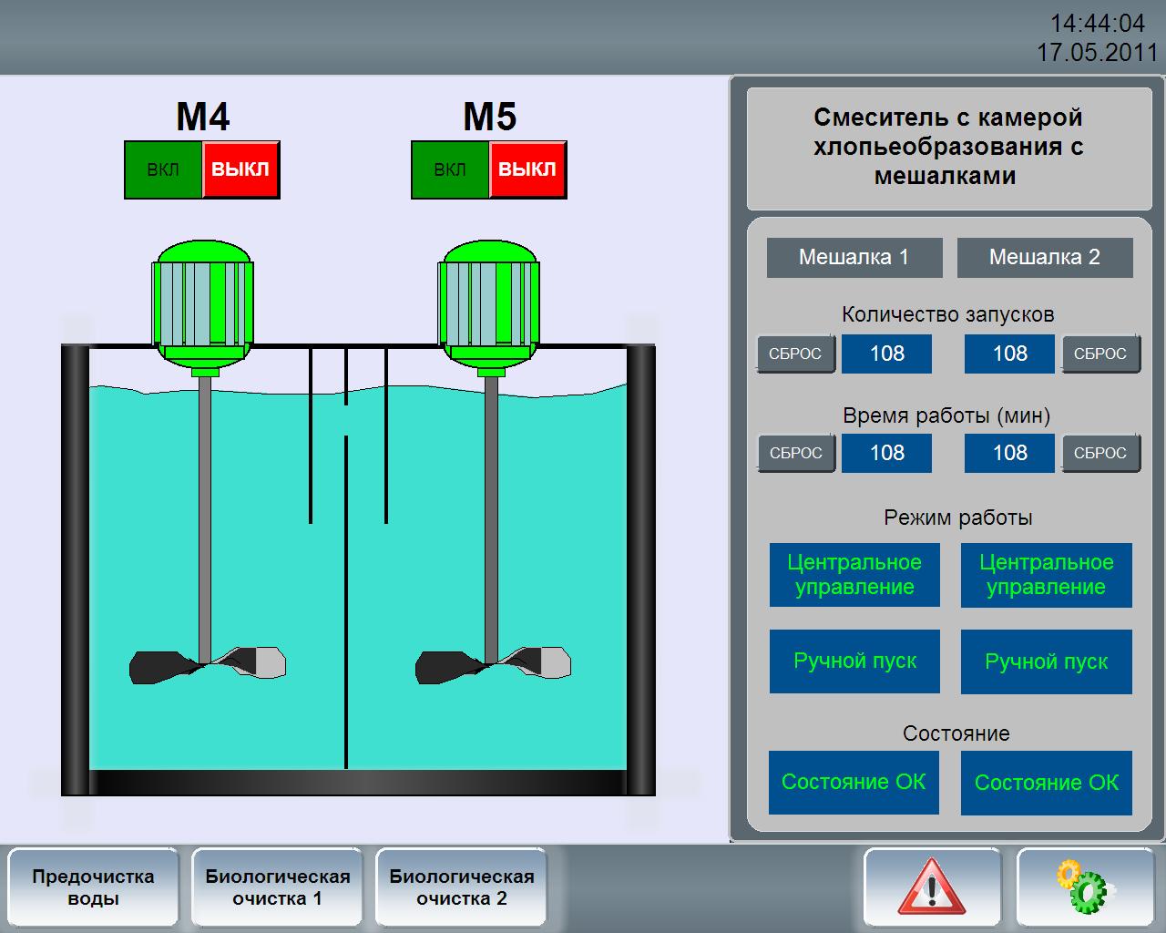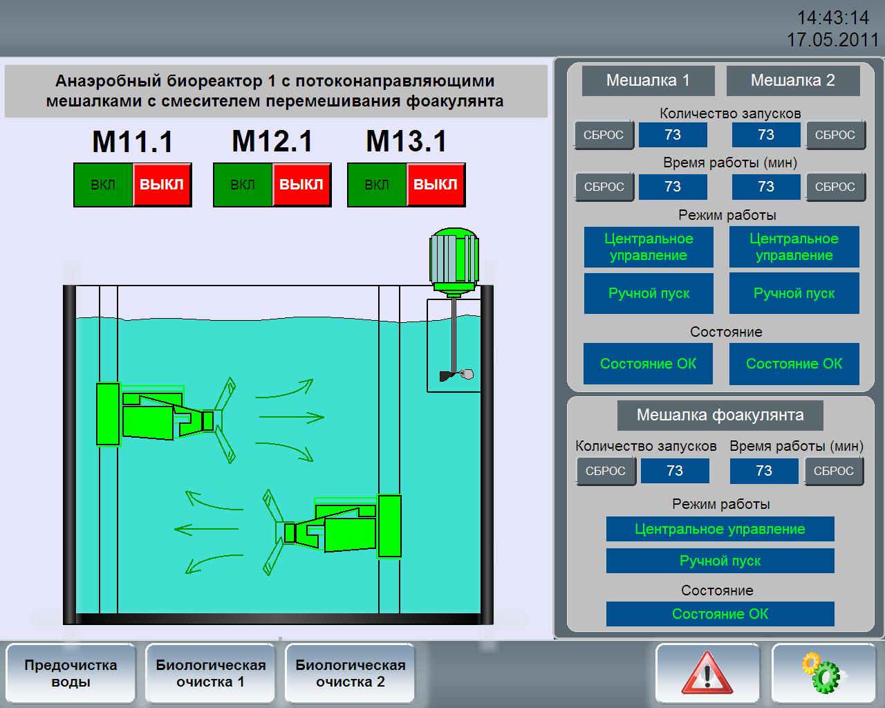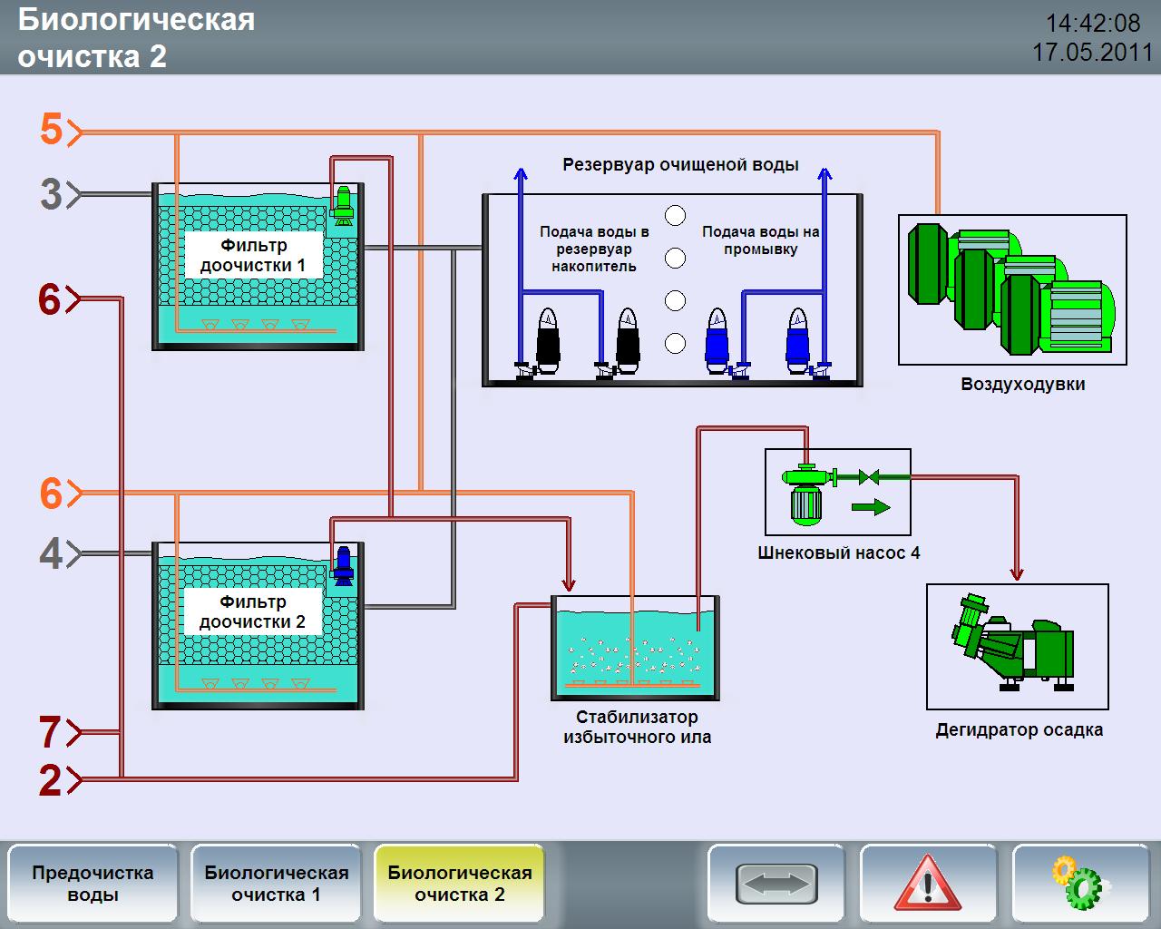 З пульта оператора в автоматичному режимі здійснюється управління технологічним процесом пуску електродвигунів насосів, мішалок очисних споруд, електроклапанів та засувок. Для перемикання режимів роботи, пуску/остановки, ведення статистики та журналу тривог, а також графічного представлення процесів використовується сенсорна панель VIPA із установленою SCADA zenon CE.