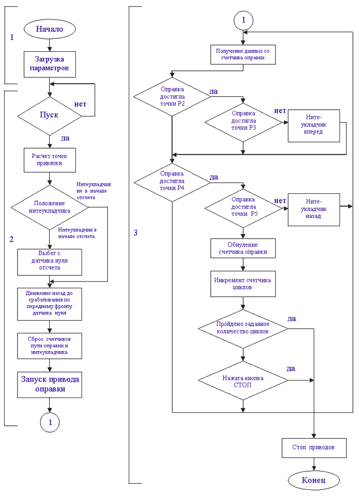 Поточне значення лічильника шляху поправки порівнюються з точкою прив'язки Р2. Якщо оправлення не досягло точки Р2, то триває вистій ниткоукладача на початку проходу, інакше перевіряється, чи досягла оправлення точки Р3. Якщо ні, то відбувається рух ниткоукладача вперед. При досягненні оправки точки Р3 починається вистій в кінці проходу і проводиться порівняння положення оправки з точкою Р4. Коли оправлення досягне точки Р4, то перевіряється, чи оправка досягла точки Р5. Якщо оправлення не досягла точки Р5, то здійснюється рух ниткоукладача назад.