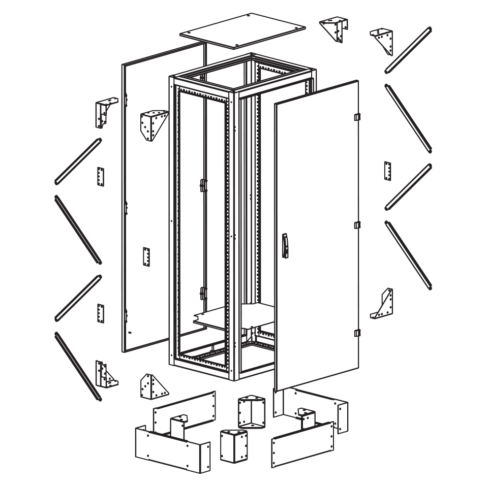 Комплект постачання: | каркас зі стельовою панеллю, двері із замком, стінка задня, суцільний захист дна, к-т для сейсмостійкості з цоколем 200 мм, к-т заземлення, ключ, упаковка |