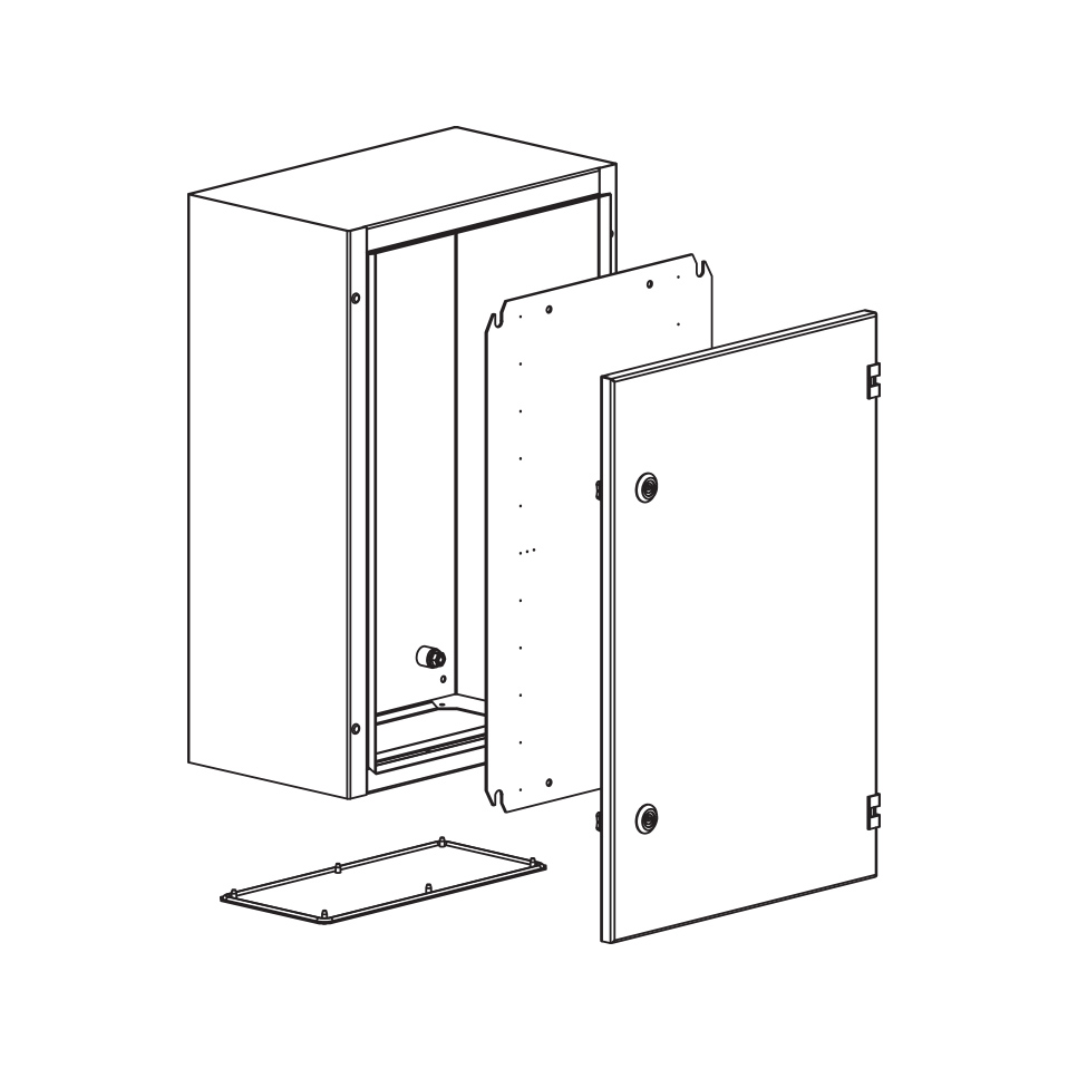 корпус та двері: структурне порошкове напилення RAL 7035; монтажна панель: цинкове покриття |