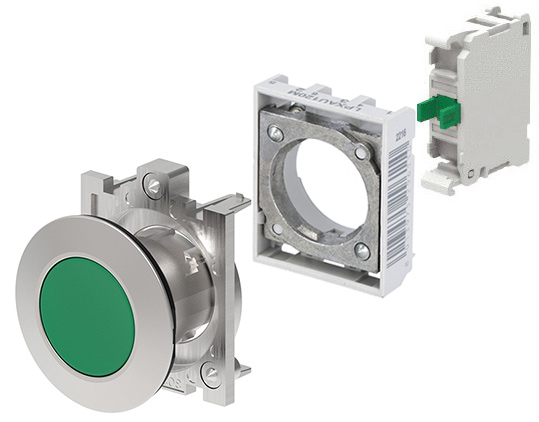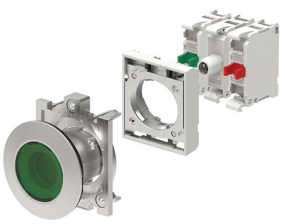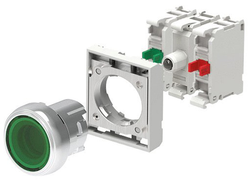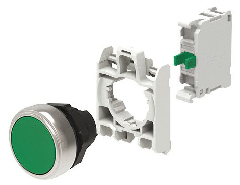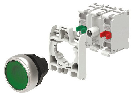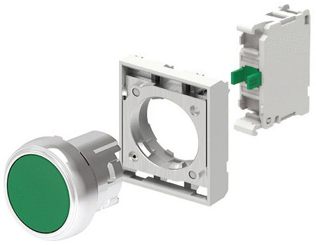 Максимальна кількість контактів — 6 (3 ряди по 2) або 4 подвійних — (2 ряди по 2); для кнопок з фіксацією — 4 (2 ряди по 2). Кнопка складається з штовхача, монтажної пластини, модуля LED- підсвічування і контактів: LPF BL/QL… + LPX AU120M + LPX L… + LPX C10 (нормально відкритий) та/або LPX C01 (нормально замкнений).