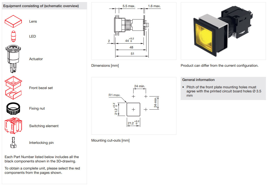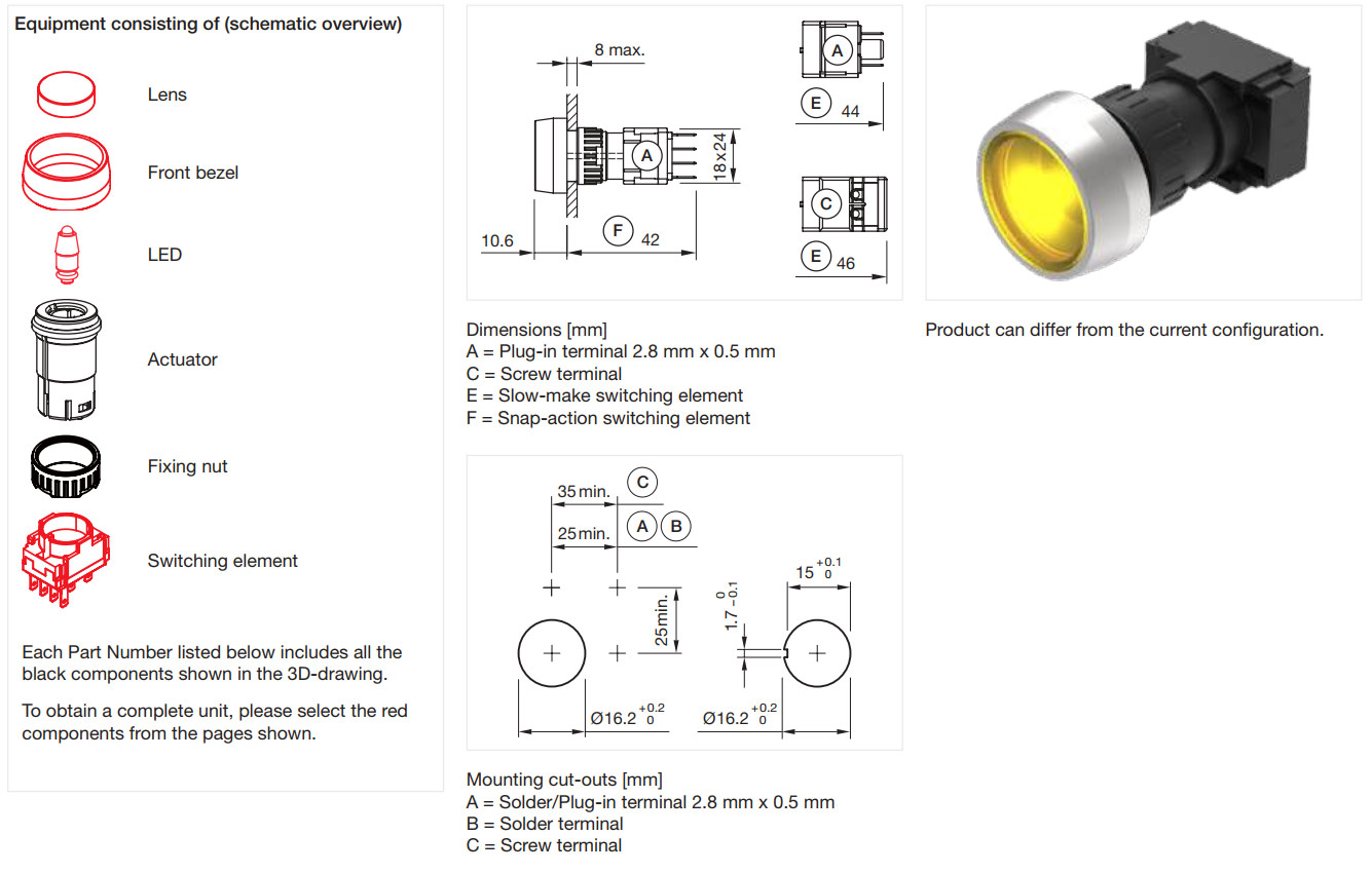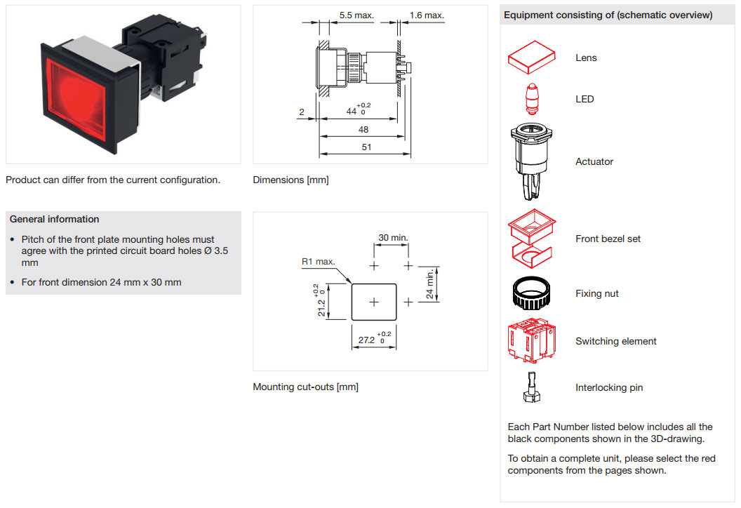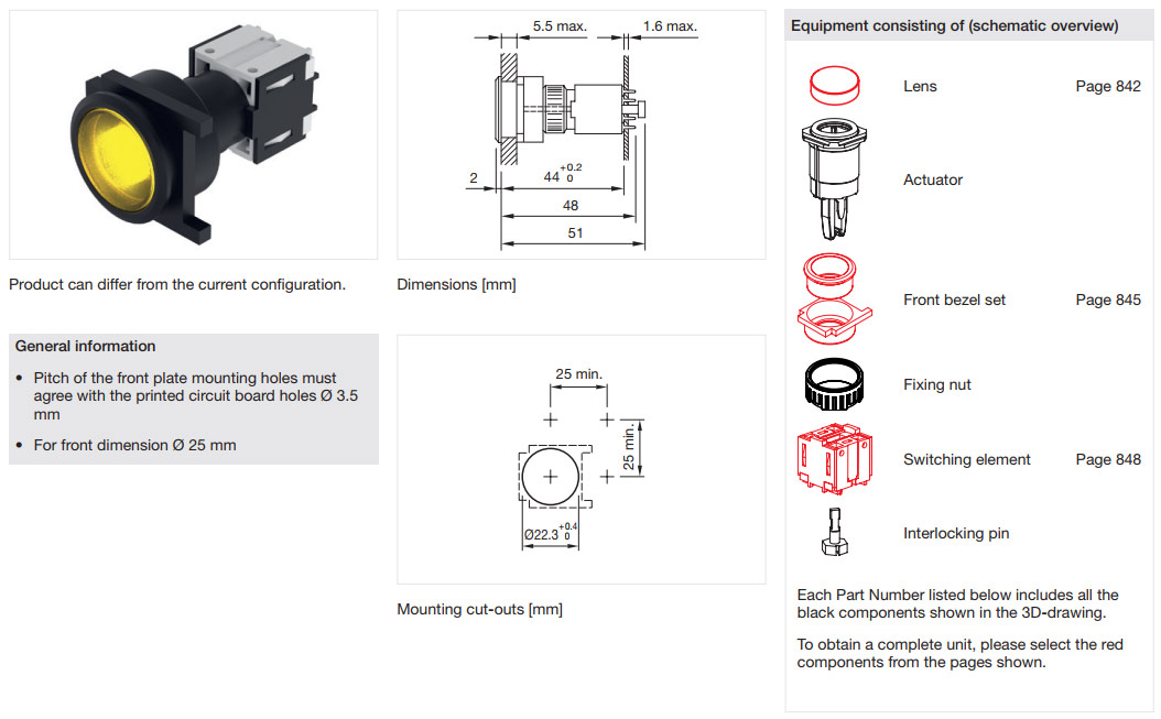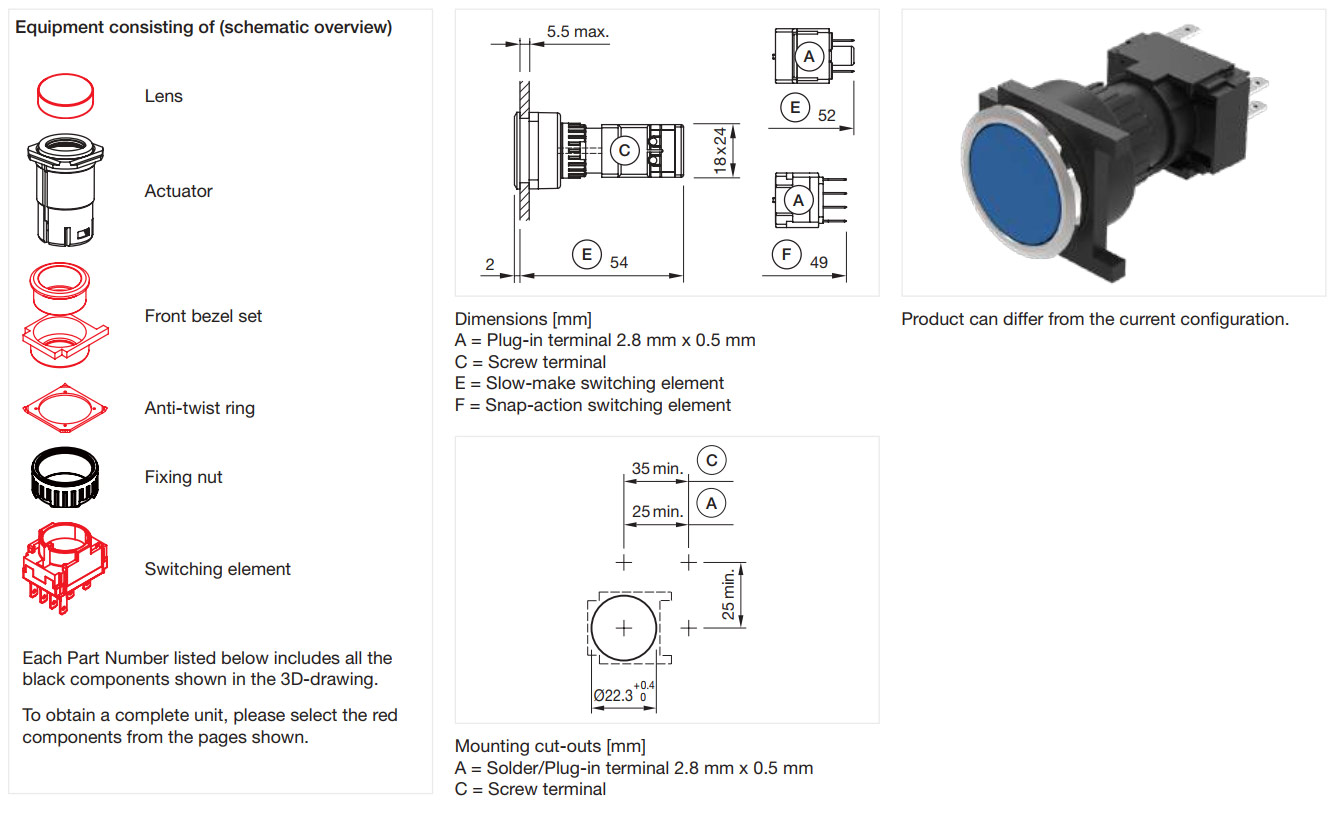 До кнопки може бути під’єднано до 3 контактних блоків (з моментальним спрацьовуванням, на напругу до 250 В), які замовляються окремо. Доступні 2 варіанти комплектації – готова кнопка з натискачем певного кольору без контактних блоків, або тільки актуатор і зовнішня рамка (все інше замовляється окремо). У таблиці нижче подано перший варіант комплектації, другий можна знайти в каталозі серії 04