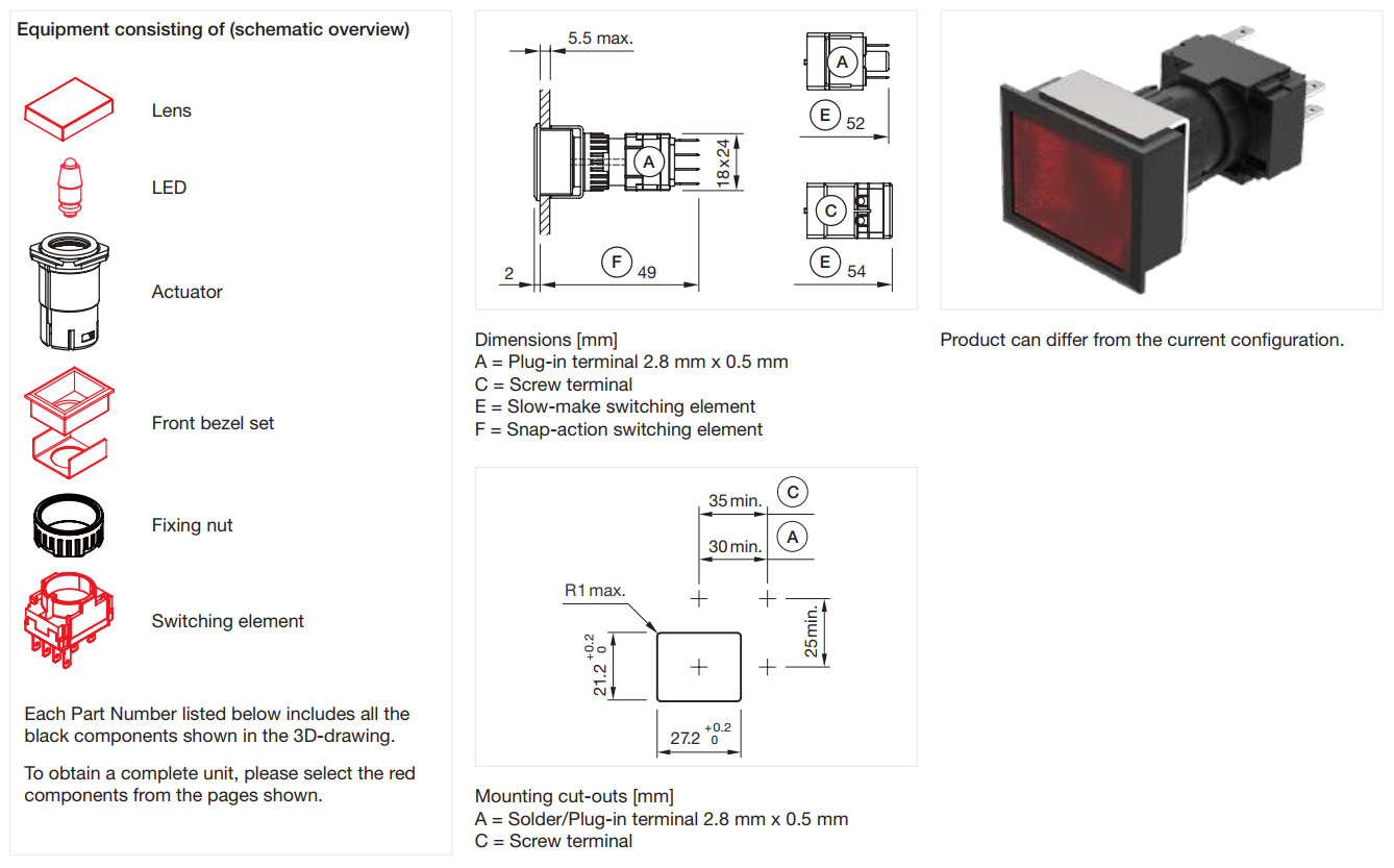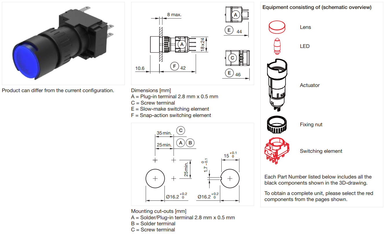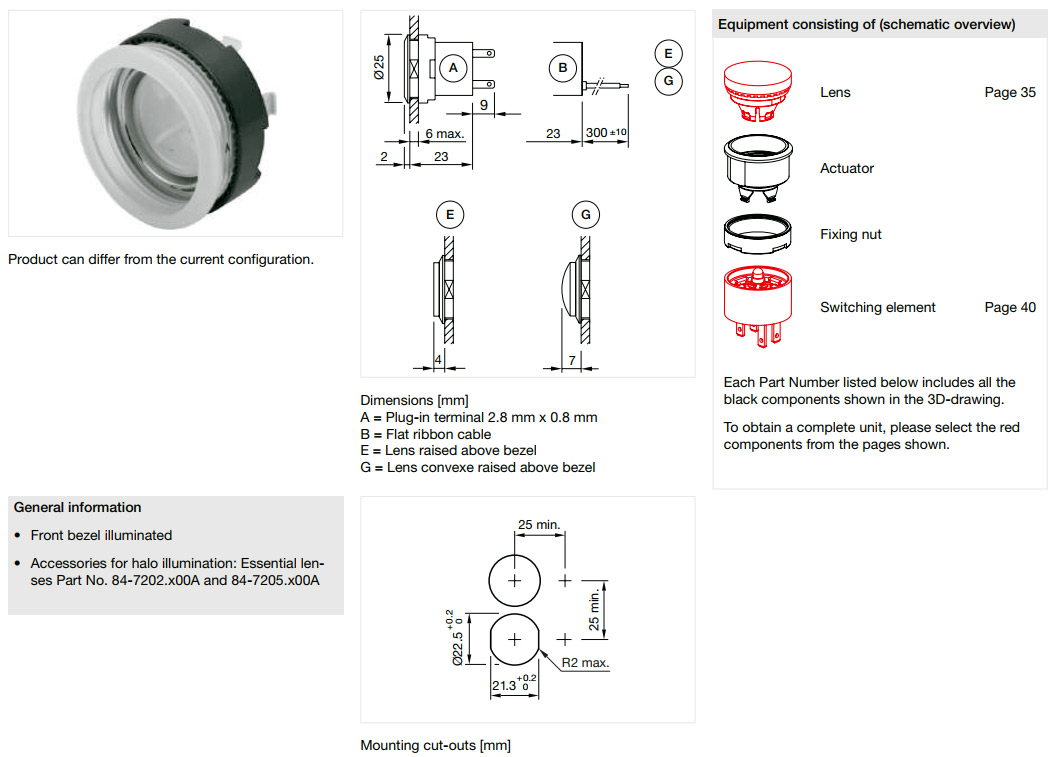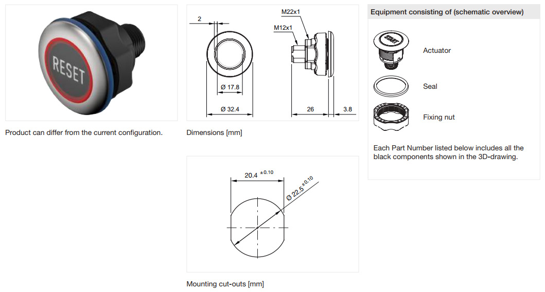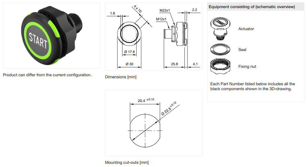 До кнопки може бути під’єднано до 3 контактних блоків (з моментальним спрацьовуванням, на напругу до 250 В), які замовляються окремо. Доступні 2 варіанти комплектації – готова кнопка з натискачем певного кольору без контактних блоків, або тільки актуатор і зовнішня рамка (все інше замовляється окремо). У таблиці нижче подано перший варіант комплектації, другий можна знайти в каталозі серії 04