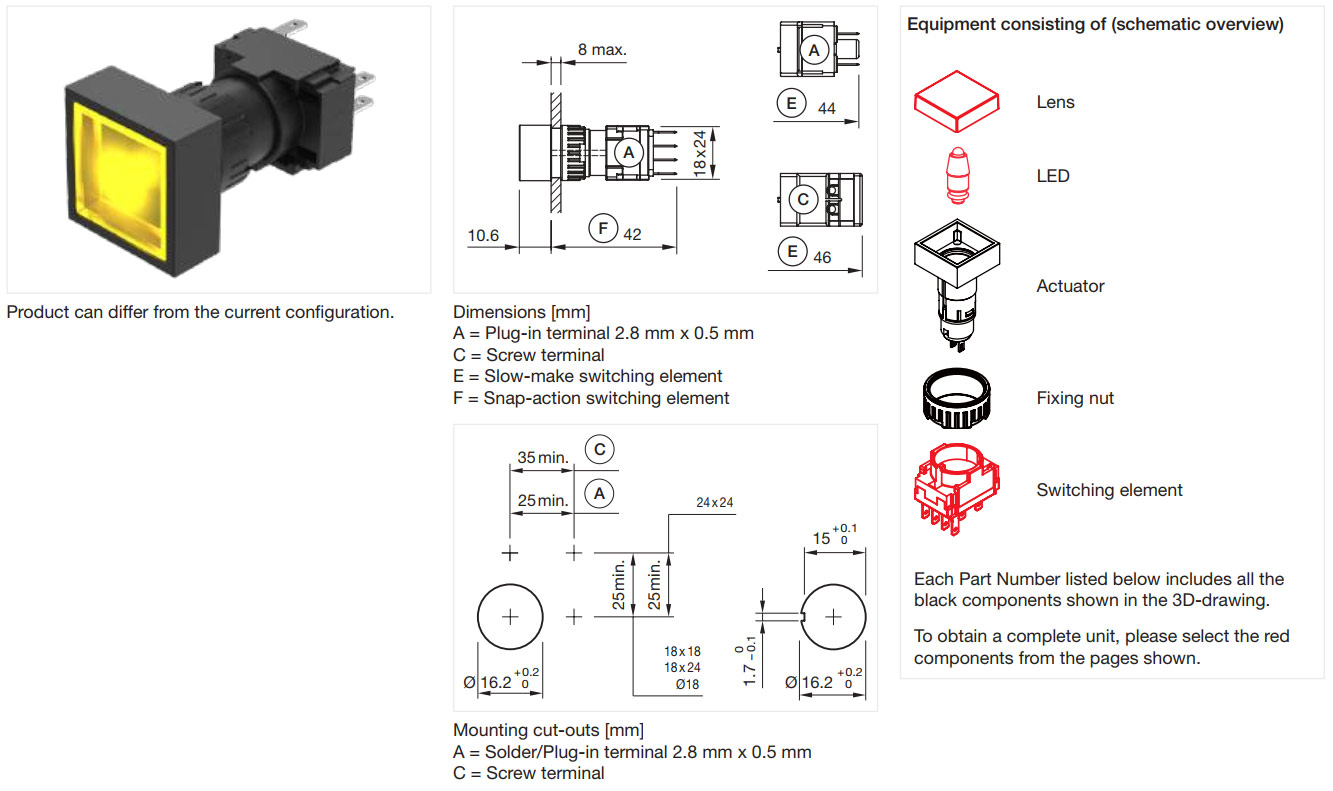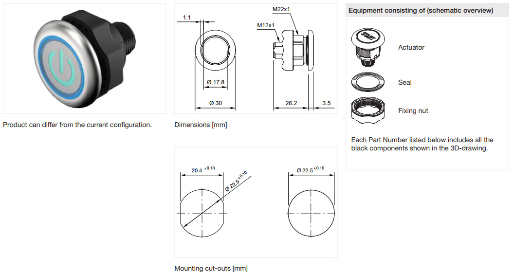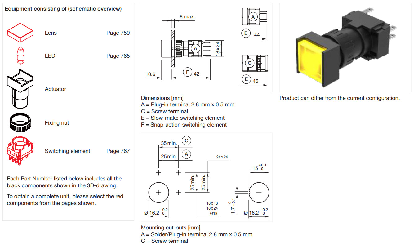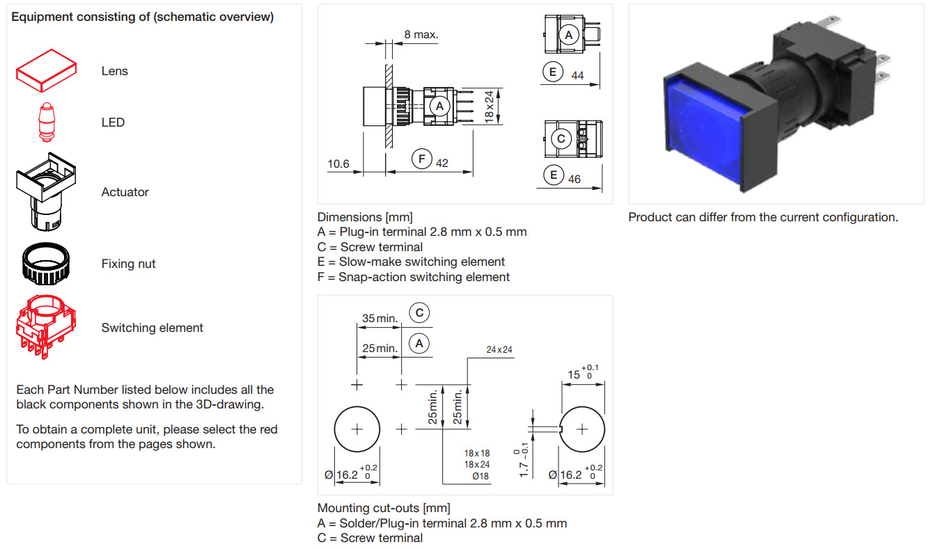 До кнопки може бути під’єднано до 3 контактних блоків (з моментальним спрацьовуванням, на напругу до 250 В), які замовляються окремо. Доступні 2 варіанти комплектації – готова кнопка з натискачем певного кольору без контактних блоків, або тільки актуатор і зовнішня рамка (все інше замовляється окремо). У таблиці нижче подано перший варіант комплектації, другий можна знайти в каталозі серії 04