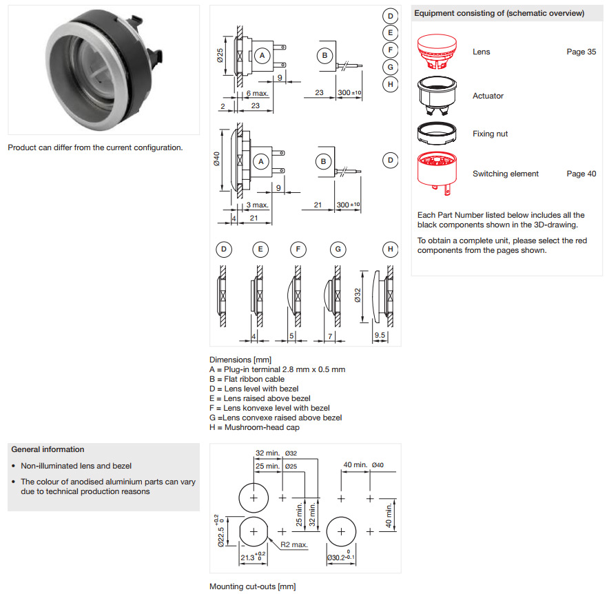 До кнопки може бути послідовно під’єднано до 3 контактних блоків, які замовляються окремо. Доступні 2 варіанти комплектації – готова кнопка з натискачем (лінзою) певного кольору без контактних блоків, або тільки актуатор і зовнішня рамка (все інше замовляється окремо). У таблиці нижче подано перший варіант комплектації, другий можна знайти в каталозі серії 04