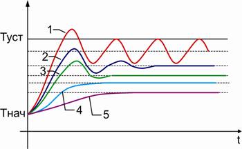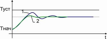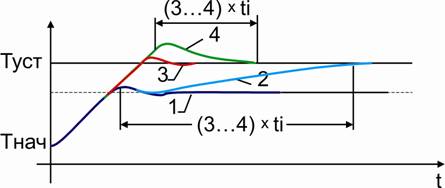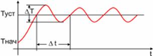 Перед настройкой зоны пропорциональности интегральная и дифференциальная компоненты отключаются, либо постоянная интегрирования устанавливается максимально возможной, а постоянная дифференцирования- минимально возможной. Устанавливается необходимая уставка SP. Зона пропорциональности устанавливается равной 0 (минимально возможной). В этом случае регулятор выполняет функции двухпозиционного регулятора. Регистрируется переходная характеристика. ![]() Тнач - начальная температура в системе Туст - заданная температура (уставка) дельта Т- размах колебаний температуры дельта D - период колебаний температуры Установить зону пропорциональности равной размаху колебаний температуры: Pb=DТ. Это значение служит первым приближением для зоны пропорциональности. Следует проанализировать переходную характеристики еще раз и при необходимости скорректировать значение зоны пропорциональности. Возможные варианты переходных характеристик показаны на рис.2. ![]() Переходная характеристика типа 1 Значение зоны пропорциональности по-прежнему очень мало, переходная характеристика (а значит, и настройка регулятора) далека от оптимальной. Зону пропорциональности следует значительно увеличить. Переходная характеристика типа 2 В переходной характеристике наблюдаются затухающие колебания (5-6 периодов). Если в дальнейшем предполагается использовать и дифференциальную компоненту ПИД регулятора, то выбранное значение зоны пропорциональности является оптимальным. Для этого случая настройка зоны пропорциональности считается законченной. Если в дальнейшем дифференциальная компоненты использоваться не будет, то рекомендуется еще увеличить зону пропорциональности так, чтобы получились переходные характеристики типа 3 или 4. Переходная характеристика типа 3 В переходной характеристике наблюдаются небольшой выброс и быстро затухающие колебания (1-2 периода). Этот тип переходной характеристики обеспечивает хорошее быстродействие и быстрый выход на заданную температуру. В большинстве случаев его можно считать оптимальным, если в системе допускаются выбросы (перегревы) при переходе с одной температуры на другую. Выбросы устраняются дополнительным увеличением зоны пропорциональности так, чтобы получилась переходная характеристика типа 4. Переходная характеристика типа 4 Температура плавно подходит к установившемуся значению без выбросов и колебаний. Эта тип переходной характеристики также можно считать оптимальным, однако быстродействие регулятора несколько снижено. Переходная характеристика типа 5 Сильно затянутый подход к установившемуся значению говорит о том, что зона пропорциональности чрезмерно велика. Динамическая и статическая точность регулирования здесь мала. Следует обратить внимание на два обстоятельства. Во-первых, во всех рассмотренных выше случаях установившееся значение температуры в системе не совпадает со значением уставки. Чем больше зона пропорциональности, тем больше остаточное рассогласование. Во-вторых, длительность переходных процессов тем больше, чем больше зона пропорциональности. Таким образом, нужно стремиться выбирать зону пропорциональности как можно меньше. Вместе с тем, остаточное рассогласование, характерное для чисто пропорциональных регуляторов (П-регуляторов), убирается интегральной