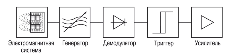 Принцип действия бесконтактного конечного выключателя (ВК) основан на изменении амплитуды колебаний генератора при внесении в активную зону датчика металлического, магнитного, ферромагнитного или аморфного материала определенных размеров. При подаче питания на конечный выключатель в области его чувствительной поверхности образуется изменяющееся магнитное поле, наводящее во внесенном в зону материале вихревые токи, которые приводят к изменению амплитуды колебаний генератора. В результате вырабатывается аналоговый выходной сигнал, величина которого изменяется от расстояния между датчиком и контролируемым предметом. Триггер преобразует аналоговый сигнал в логический, устанавливая уровень переключения и величину гистерезиса.