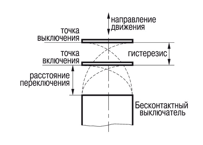 Под гистерезисом понимается разность между точкой включения при приближении измерительной пластинки и точкой выключения при ее отдалении от бесконтактного выключателя. Величина гистерезиса указывается в % от номинального расстояния переключения.