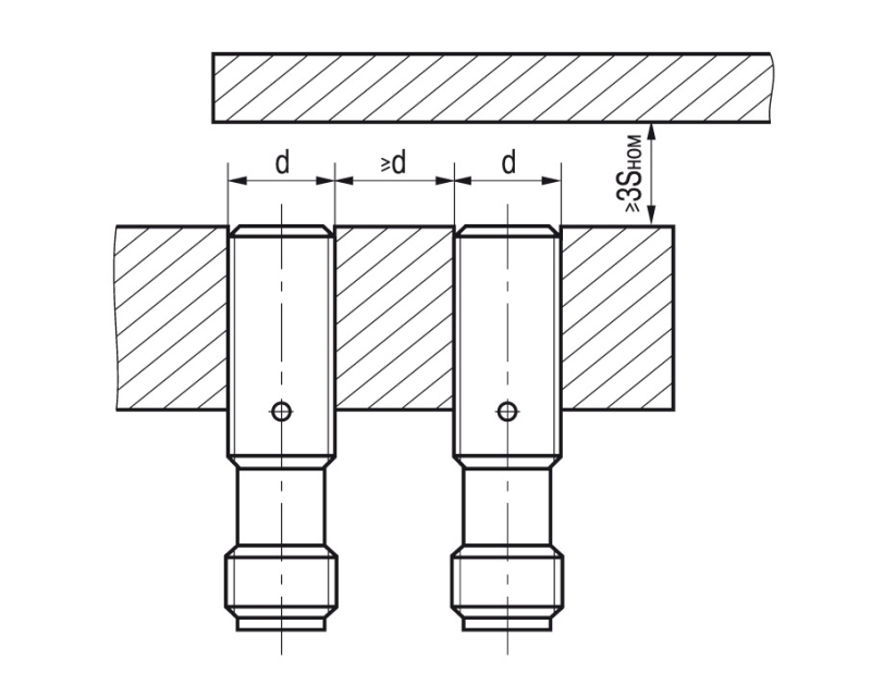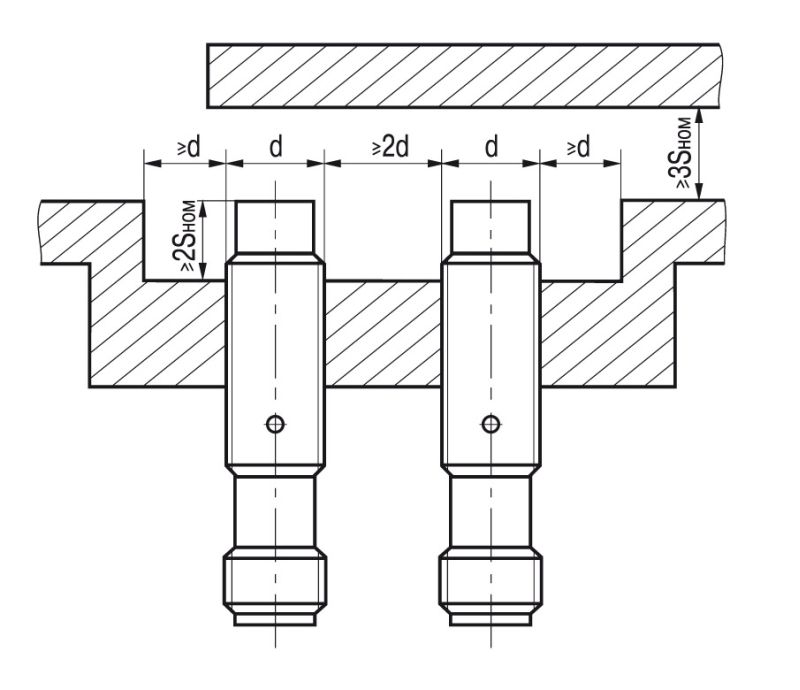 Бесконтактные выключатели могут быть встроены в металл до торцевой чувствительной поверхности без изменения рабочих параметров. Между двумя соседними выключателями должно быть расстояние не менее диаметра датчика.