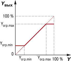 Так как рабочий диапазон исполнительного механизма всегда ограничен, для выходного управляющего сигнала Yвых задаются ограничения в виде максимального и минимального значений. Если выходной сигнал регулятора Y превышает заданную величину Yогр.max, то на исполнительное устройство выдается сигнал Yогр.max, если сигнал меньше заданной величины Yогр.min, то выдается сигнал Yогр.min.