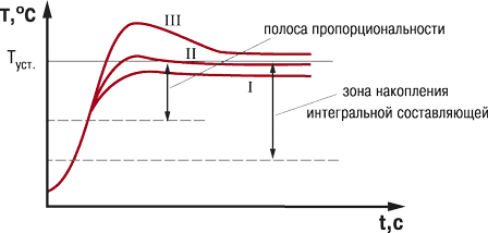 Для устранения влияния этого эффекта задают зону накопления интеграла, в пределах которой регулятор вычисляет интегральную составляющую. За пределами этой зоны, где интегральная сумма слишком велика, для формирования управляющего сигнала используется только пропорциональная составляющая. В зависимости от режима работы регулятора (нагреватель или холодильник), эта зона расположена выше или ниже уставки. Если регулятор управляет задвижкой без датчика положения, значение этого параметра не влияет на работу регулятора.