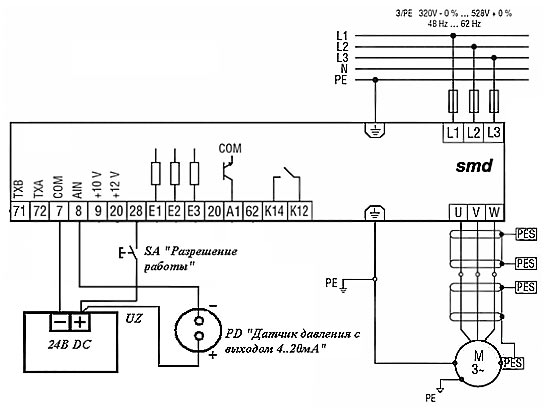 Перетворювач частоти ESMD має внутрішній ПІ-регулятор процесу, який можна використовувати для створення простого керування тиском.