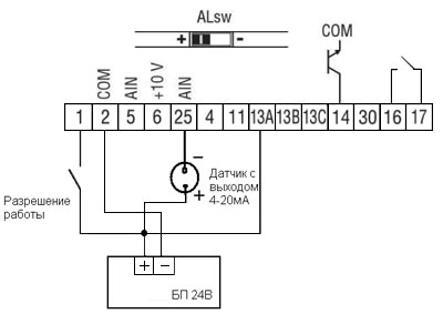 Схема підключення датчика та проводів керування до перетворювача частоти має такий вигляд.