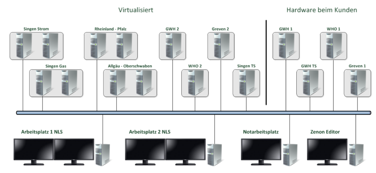 Кілька років тому Thüga Energienetze віртуалізувала свою серверну структуру, що значно спростило процес резервного копіювання та відновлення окремих серверів керування. Також таке рішення дозволило легко та без ризику оновлювати версії zenon. Концептуально система має наступну структуру: основний сервер, на якому працює система керування, розташований у диспетчерській кінцевого замовника, а резервний — у центральній диспетчерській Thüga Energienetze. Таим чином, якщо з якихось причин обірветься комунікація з системою керування дистрибюцією, клієнт все одно зможе подбати про роботу мережі.