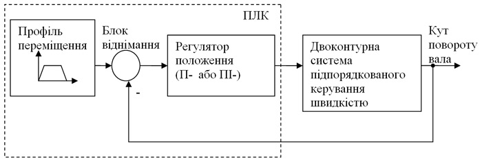 Компромісним, та в більшості випадків, оптимальним рішенням для реалізації системи керування положенням на базі асинхронного двигуна з енкодером є розподілення контурів регулювання по різних програмовних пристроях. Так, контур регулювання швидкості, що забезпечує високий діапазон керування частотою обертання, реалізується на базі відповідного перетворювача частоти із вбудованими високочастотними входами. Контур регулювання положення і профілі переміщення з обмеженням максимальної швидкості та прискорення реалізуються програмно на базі ПЛК, як вказано на схемі: