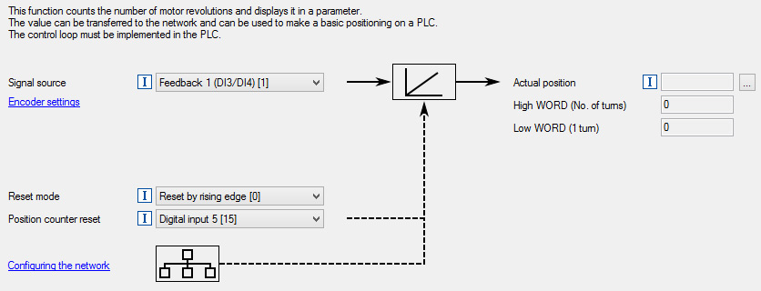 Приємним бонусом для реалізації керування переміщенням є можливість зовнішнього обнуління поточного положення як дискретним сигналом, так і за допомогою промислового інтерфейсу. Схема налаштування обнуління сигналу від частотних входів підключення енкодера DI3/DI4 має вигляд: