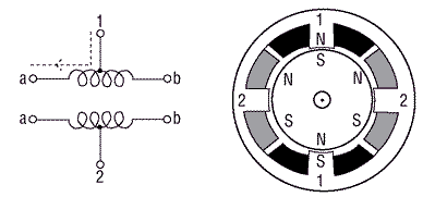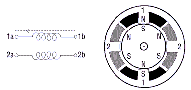 Биполярные шаговые двигатели с постоянными магнитами и гибридные двигатели сконструированы более просто, чем униполярные двигатели, обмотки в них не имеют центрального отвода (см рис.2).