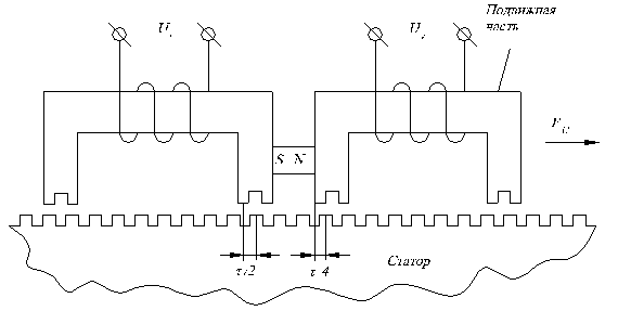 Зубцовые деления статора и подвижной части двигателя равны. Зубцовые деления в пределах одного магнитопровода ротора сдвинуты на половину зубцового деления t/2. Зубцовые деления второго магнитопровода сдвинуты относительно зубцовых делений первого магнитопровода на четверть зубцового деления t/4. Магнитное сопротивление потоку подмагничивания не зависит от положения подвижной части.