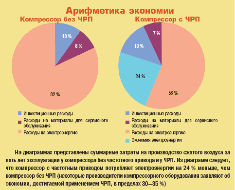 Порівняльний аналіз роботи гвинтового компресора з електродвигуном потужністю 60 кВт і максимальним тиском 10 бар (за, завантаженим на 70 % при річному напрацюванні 4000 годин) і того ж пристрою з частотним регулюванням призводить до наступних результатів на користь ЧРП:
