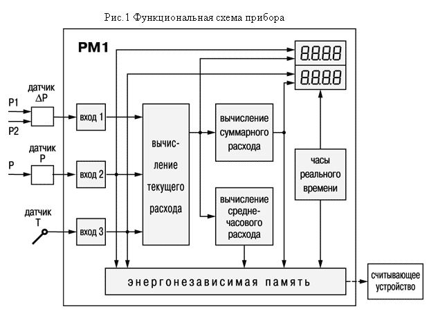 Так как перед нами была поставлена задача реализовать регистрацию таких параметров как расход газа, его давление и температуру, а также подключить расходомер к компьютеру, то было решено использовать вместе с самим расходомером РМ1 такие функциональные блоки: