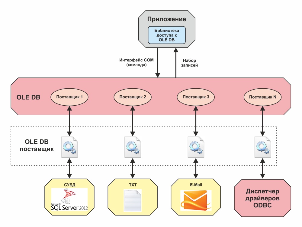 Доступ до джерела даних із “Програми” здійснюється за допомогою “Бібліотеки доступу до OLE DB”. Бібліотека на запити "Додатки" створює COM-об'єкти, отримує інтерфейси та викликає їх методи, формуючи тим самим команди. Команди обробляються відповідним провайдером, який запитує дані у джерела, формує записи, заповнює їх отриманими даними та повертає додатку.