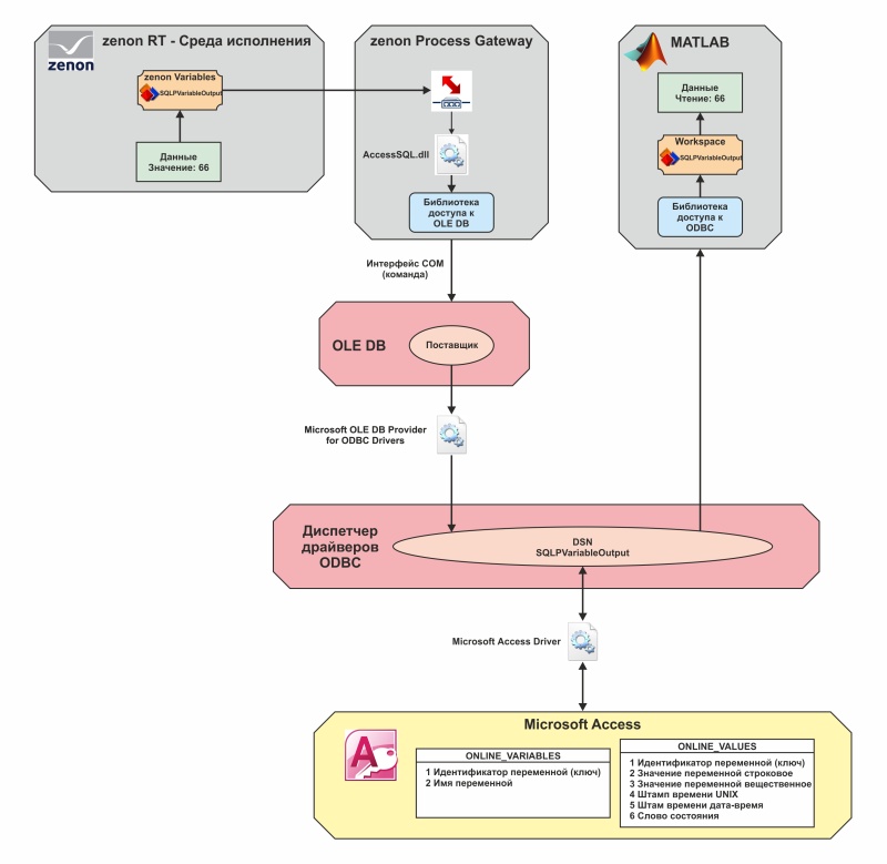 SCADA система zenon підтримує як односпрямований, і двонаправлений доступом до значенням змінних через СКБД. Для реалізації двонаправленого доступу використовується драйвер "SQL Driver". На відміну від модуля SQL Online драйвер використовує одну таблицю для отримання даних через СКБД, а другу таблицю для передачі даних. Нижче на малюнку наведено процес обміну даними між SCADA системою zenon та програмним забезпеченням MATLAB.