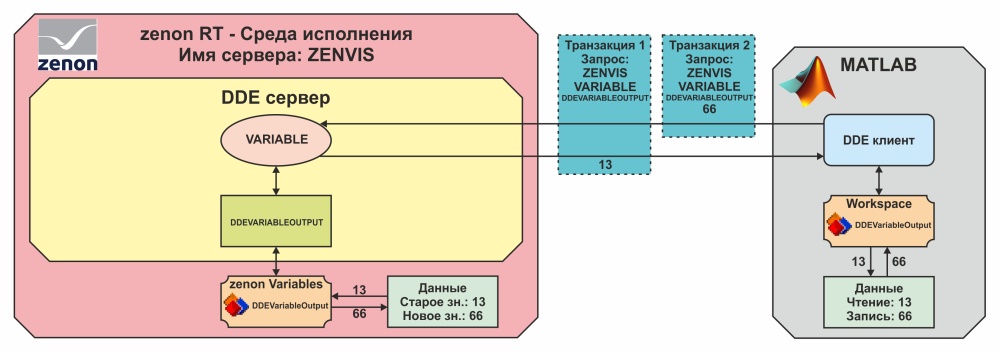 Доступ до змінних SCADA системи zenon можливий лише під час роботи середовища виконання (Runtime). При формуванні запиту з боку DDE клієнта як ім'я сервера має бути встановлено значення “ZENVIS”. Змінні доступні для DDE сервера перебувають у темі “VARIABLE”, а назва розділу збігається з ім'ям змінної “DDEVARIABLEOUTPUT”, регістр символів у назві змінної значення немає.