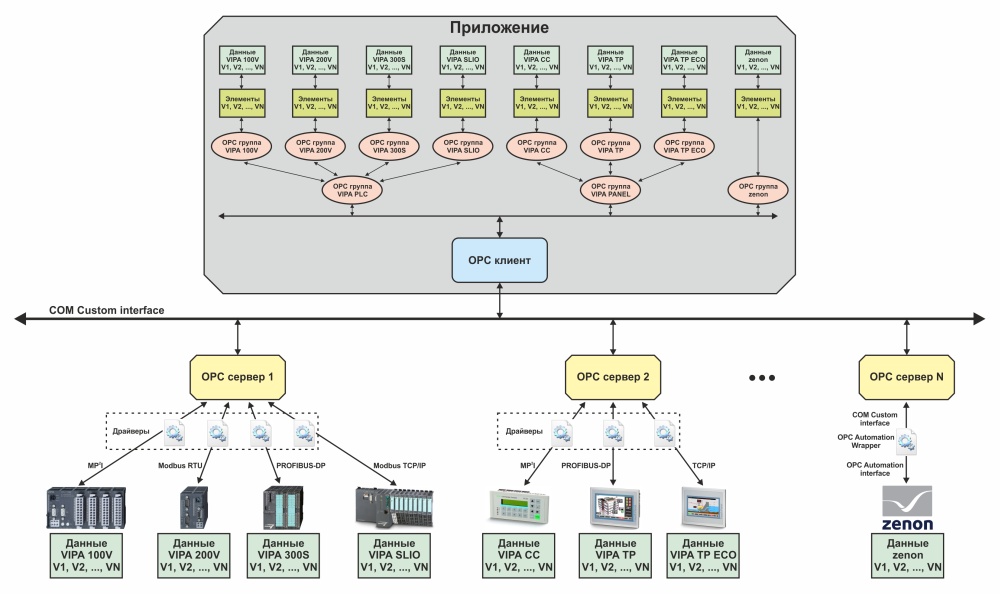 На малюнку наведено типову структуру взаємодії "Додатки" клієнта з OPC серверами. Програмовні логічні контролери підключені до "OPC сервера 1", панелі людино-машинного інтерфейсу до "OPC сервера 2", а SCADA система zenon до "OPC сервера N". "Додаток" за допомогою "OPC клієнта" підключений до всіх OPC серверів. Елементи OPC серверів додані до груп таким чином, щоб зручно було визначити до якого пристрою або програмного забезпечення вони відносяться.