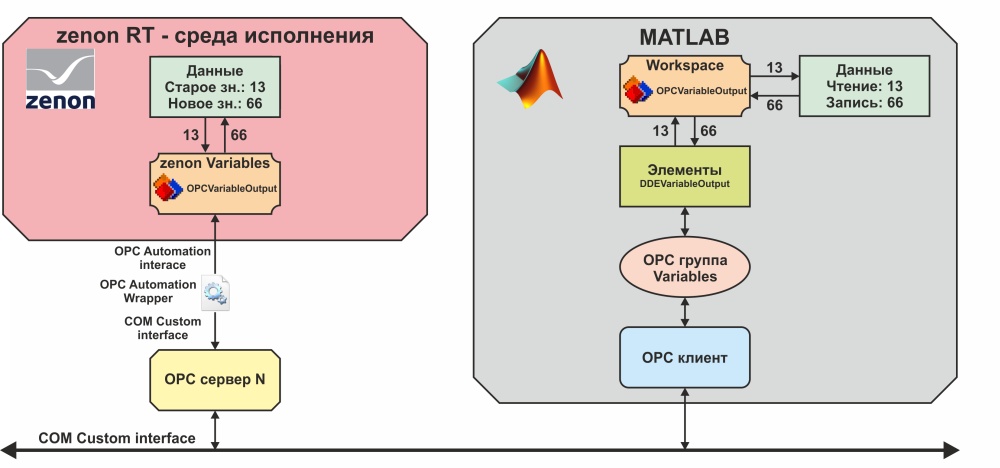 Далі наведено приклад програми на мові MATLAB, що дозволяє отримати значення змінної "OPCVariableOutput" і задати їй нове значення (для того, щоб у MATLAB працював OPC Toolbox, необхідно за допомогою команди "opcregister('install')") встановити OPC клієнт: