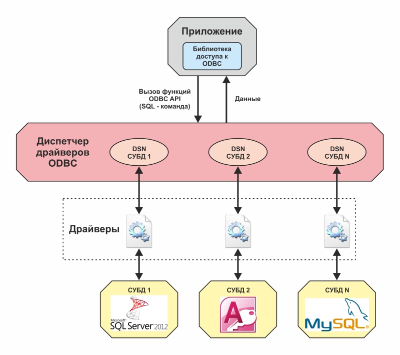 Доступ до джерела даних “Програми” здійснюється за допомогою “Бібліотеки доступу до ODBC”. Бібліотека на запити “Програми” здійснює виклики функцій ODBC API, формуючи таким чином SQL-команди для джерела даних з відповідним ім'ям DSN. SQL-команди передаються “Диспетчеру драйверів ODBC”, який перенаправляє їхньому відповідному драйверу пов'язаному з DSN. У відповідь на виклик функції “Додаток” отримує дані або результат виконання SQL-команди.