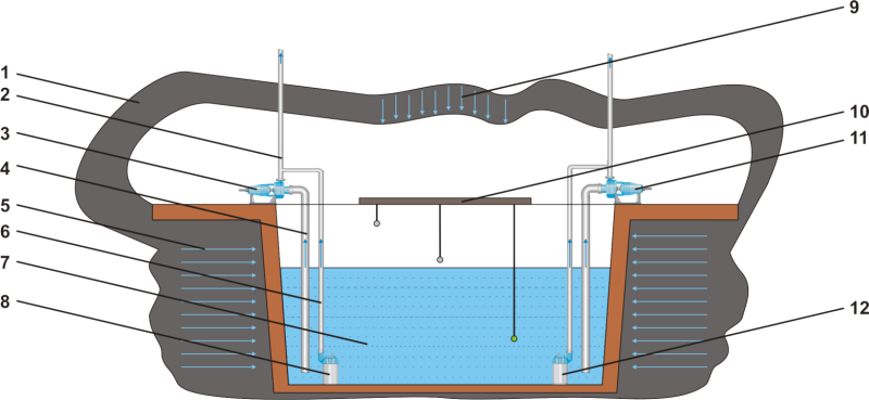 1 – гірські породи; 2 – нагнітальна труба; 3 – основний насос; 4 – всмоктувальна труба; 5 – підземна вода; 6 — нагнітальна труба заливного насоса основного насоса; 7 – водозбірник; 8 – заливальний насос основного насоса; 9 – поверхнева вода; 10 – контроль рівня води; 11 – додатковий насос; 12 – заливальний насос додаткового насоса