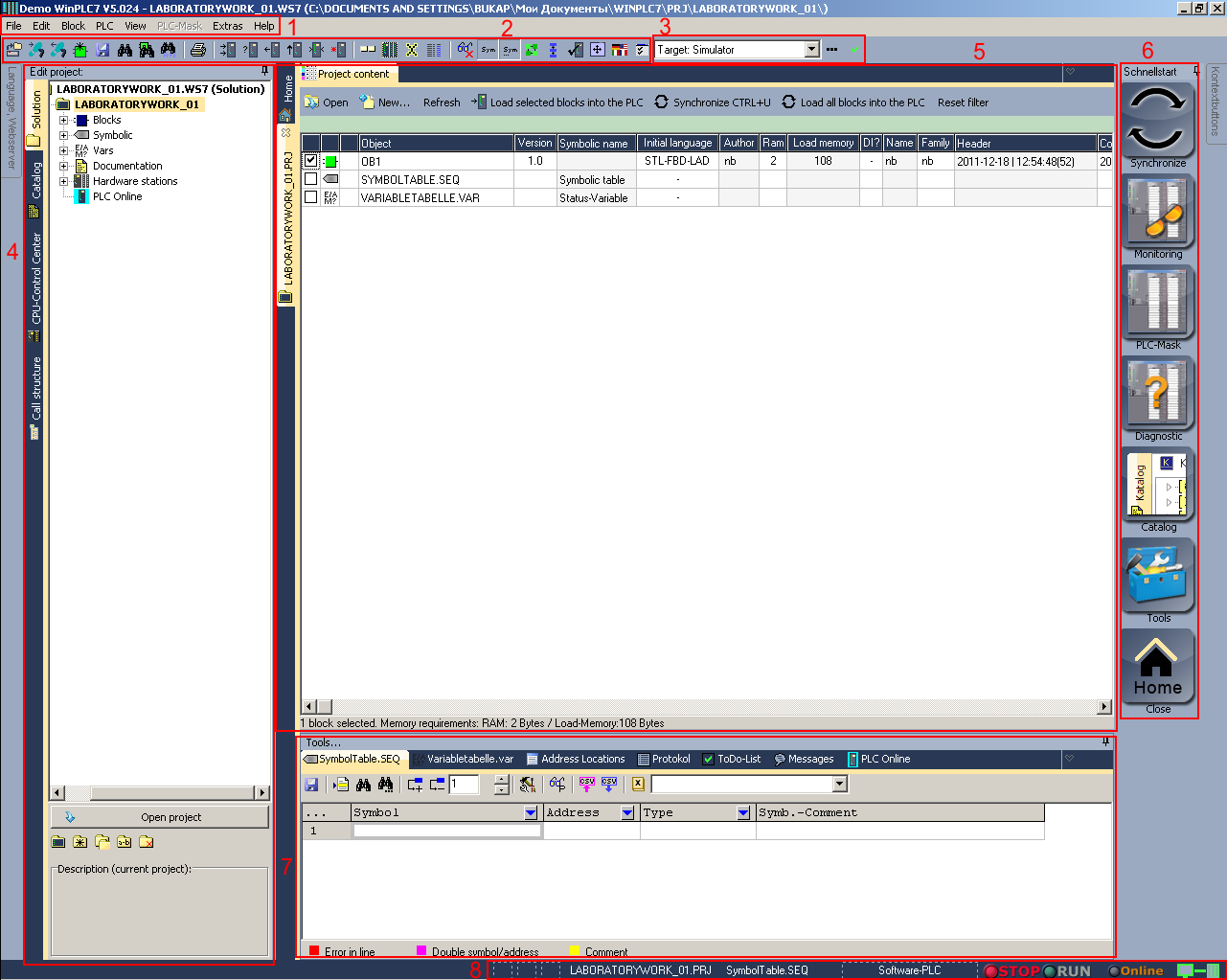 У новому проекті за умовчанням як цільовий об'єкт використовується “Simulator” (Симулятор). Так само в ньому вже створено організаційний блок OB1, таблицю символьних змінних та таблицю змінних стану. Стан підключення до контролера та його роботи відображається у рядку станів.