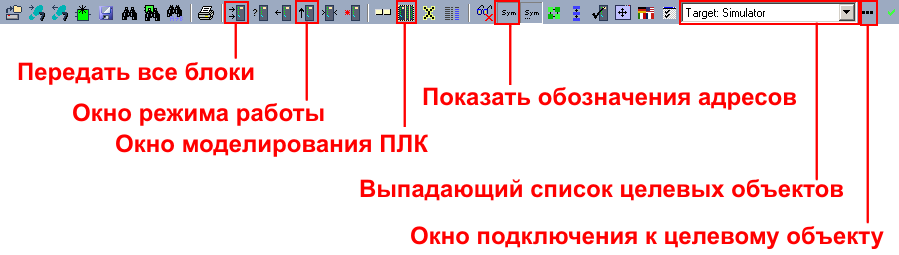 Для завантаження програмного забезпечення на цільовий об'єкт використовується кнопка на панелі швидких кнопок “Передати всі блоки”. При відсутності фізичного контролера тестування програмного забезпечення можна виконувати в симуляторі, для цього за допомогою списку підключення до цільового об'єкта необхідно вибрати “Simulator” (Симулятор).