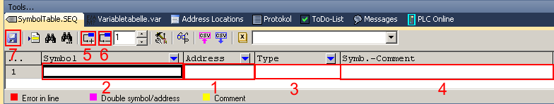 При додаванні змінної спочатку необхідно ввести адресу (1), після чого відредагувати символічне ім'я (2), тип (3) і коментар (4). Для зручності швидкого додавання великої кількості змінних з адресами, що йдуть поспіль, використовуються кнопки “Копіювати та інкрементувати адресу” (5) та “Копіювати та декрементувати адресу” (6). Спочатку необхідно ввести початкову або кінцеву адресу змінної, після чого за допомогою відповідної кнопки додати необхідну кількість змінних. Далі виконати редагування символьних імен, типів та коментарів. Після закінчення редагування позначок необхідно зберегти зміни використовується кнопку “Save” (Зберегти) (7).