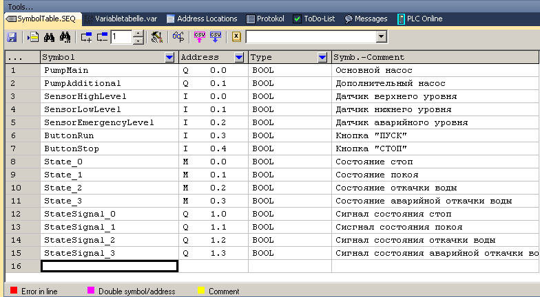 У таблиці символьних імен кожному меркер задати символьне ім'я: State_0, State_1, State_2, State_3. Виробник ПЛК рекомендує як символьні імена для станів системи використовувати їх назви, у цьому випадку імена змінних обрані для спрощення реалізації графа станів у вигляді програми.