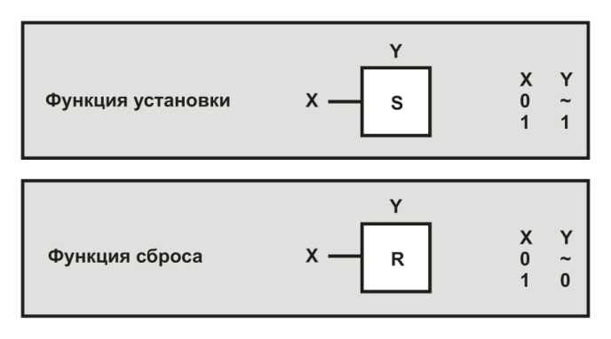 Функції установки та скидання (рис. 17.) можуть завершувати логічну операцію. Ці елементи активуються лише тоді, коли результат логічної операції, що прямує до блокового елемента, дорівнює “1”.