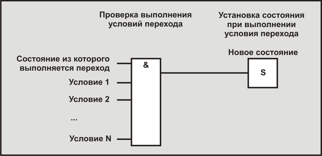 Умова переходу перевіряється функцією І, якщо немає встановленого стану, отже система запускається вперше після перепрограмування контролера або був виконаний повний перезапуск і всі дані були видалені. Якщо умова виконується, значення стану стоп встановлюється, також встановлюється сигнал стану.