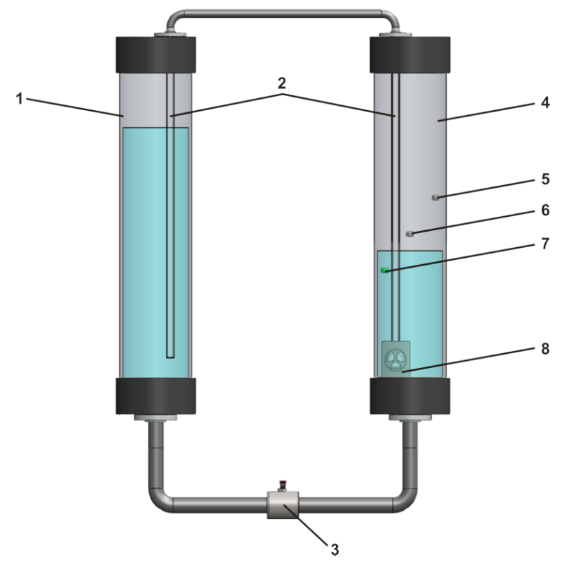 1 – колба припливу; 2 – трубка; 3 – заслінка; 4 – колба, що імітує водозбірник; 5 – датчик аварійного рівня; 6 – датчик верхнього рівня; 7 – датчик нижнього рівня; 8 — насос