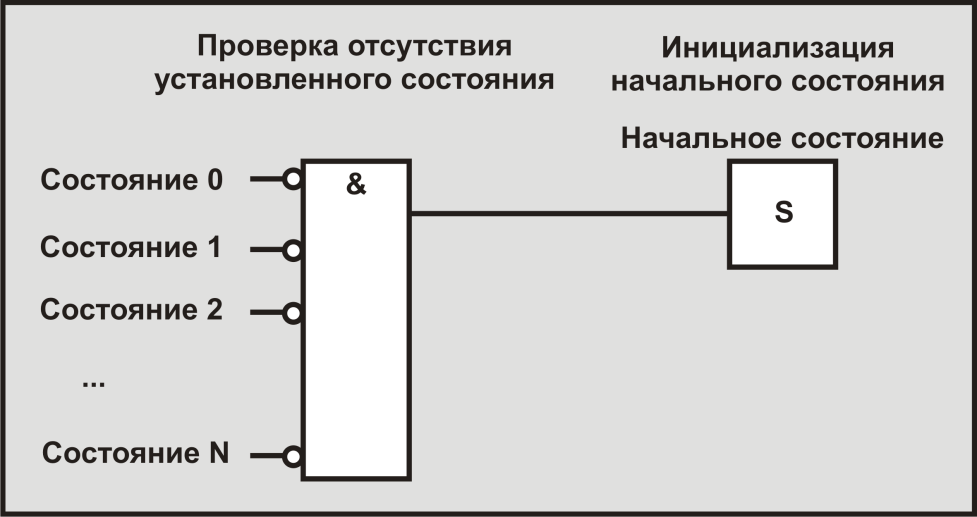 Під час запуску контролера відбувається ініціалізація пам'яті, прапори станів набувають нульового значення. Для встановлення початкового стану використовується сегмент установки стану. Умова формується так, що якщо не один із станів не встановлений, встановлюється початковий стан (рис. 20.).