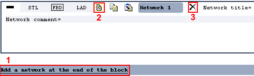 Сегмент та його панель швидких кнопок представлені на рис. 21.. Для додавання нового сегмента в кінець організаційного блоку необхідно натиснути кнопку "Add a network at the end of the block" (Додати сегмент в кінець блоку) (1). Щоб додати новий сегмент перед існуючим, необхідно натиснути кнопку “Додати сегмент перед поточним” (2). Щоб видалити “Delete network” (Видалити сегмент) (3).