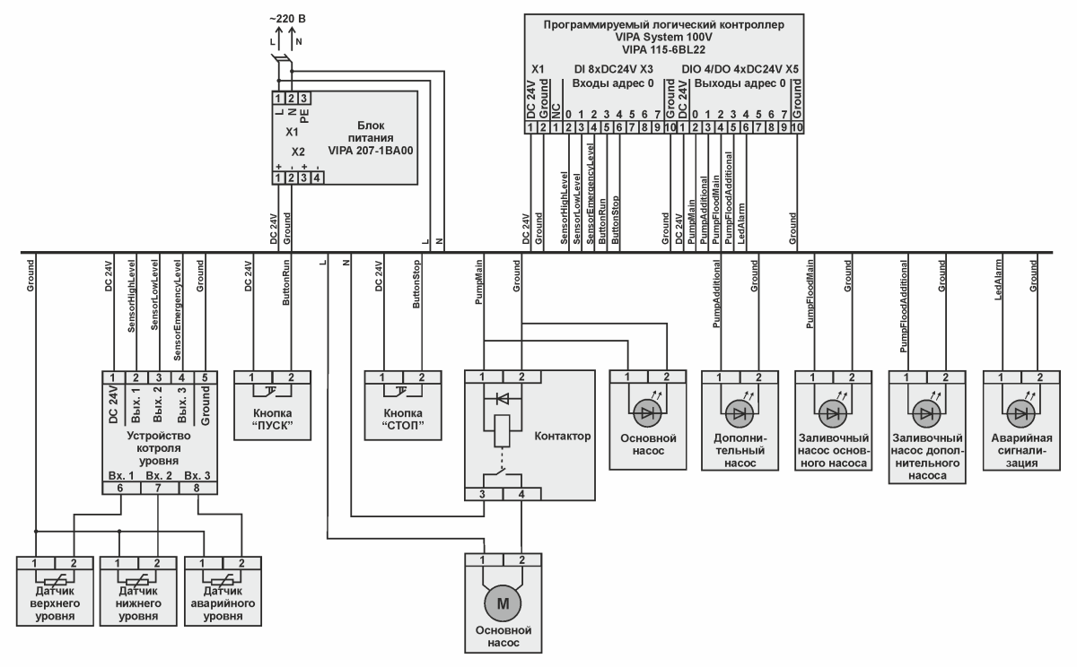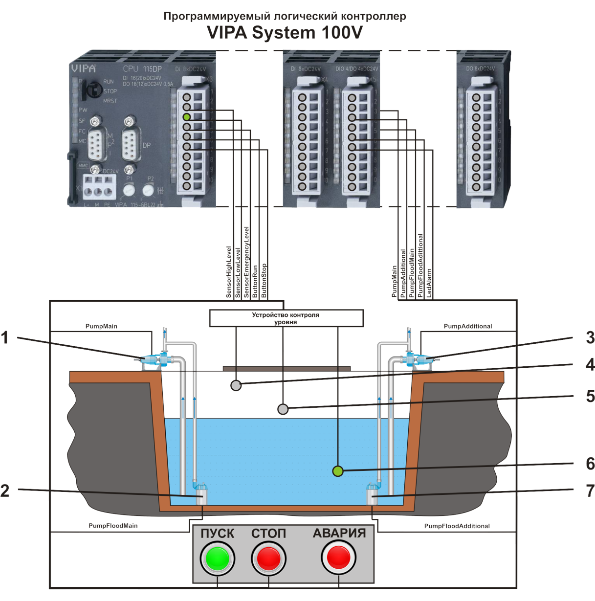 Система керування шахтного водовідливу реалізована на базі програмовного логічного контролера VIPA System 100V. До контролера підключені датчики та виконавчі елементи фізичної моделі шахтного водовідливу: датчики нижнього рівня, верхнього рівня, аварійного рівня та насос.